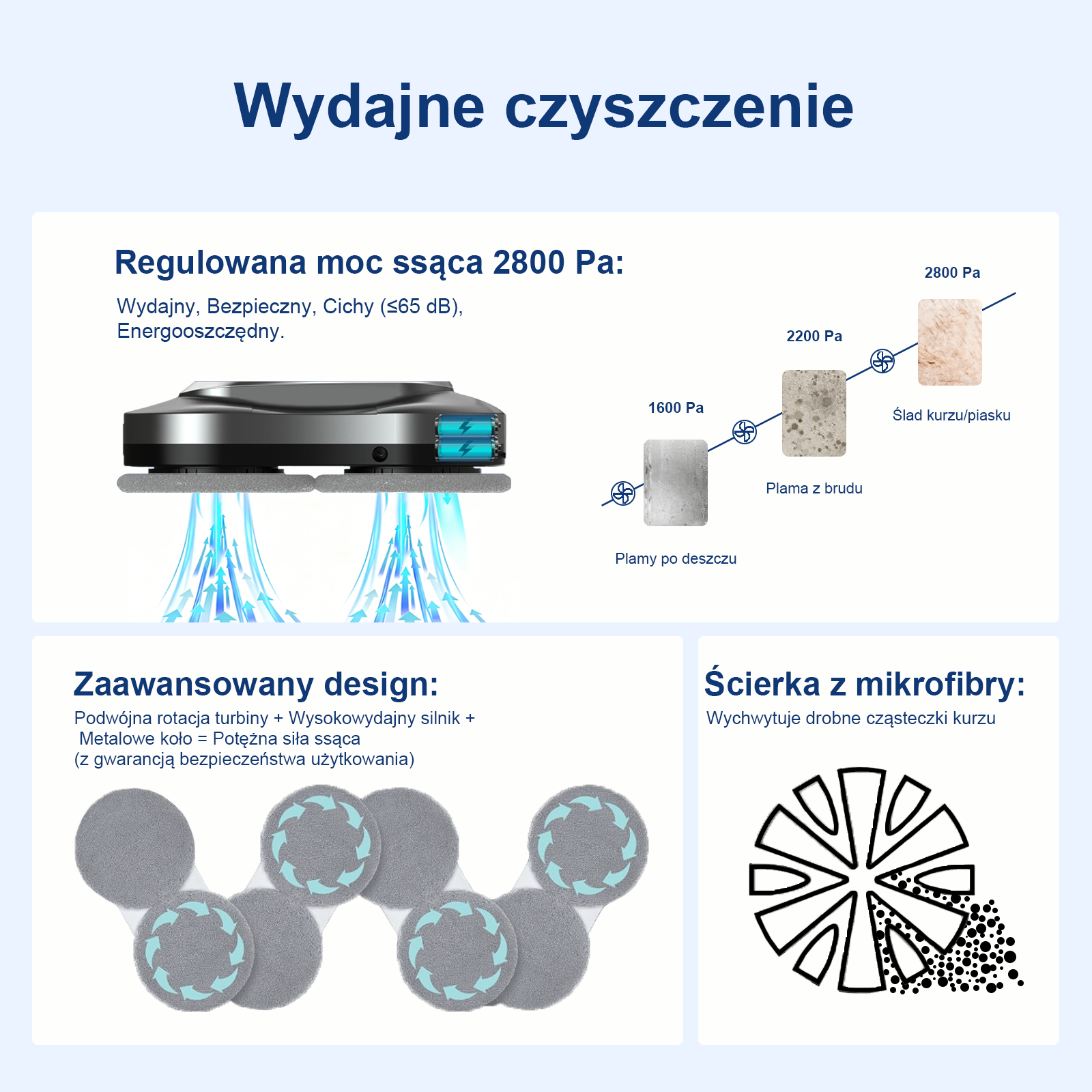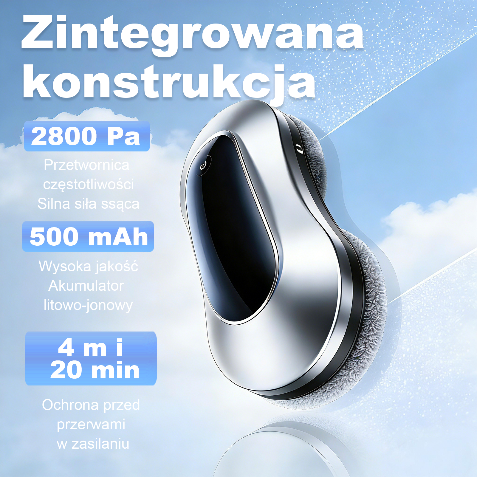Wykorzystuje zaawansowaną technologię adsorpcji, aby zapewnić mocne przyleganie do powierzchni szkła podczas czyszczenia bez ryzyka odpadnięcia. Zmienna moc ssania 2800–3200 Pa dostosowana do częstotliwości.